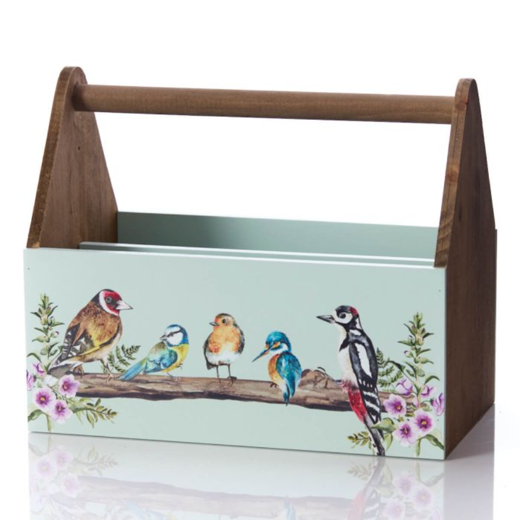 Add a burst of charm to any space with this playful Floral Feathered Wood Bird Caddy. Crafted in light mint green wood, it features side panels and a front adorned with colourful painted flowers and five whimsical birds perched on a branch. The sturdy handle makes it easy to carry, perfect for organizing or displaying your favourite treasures with a touch of nature-inspired fun.