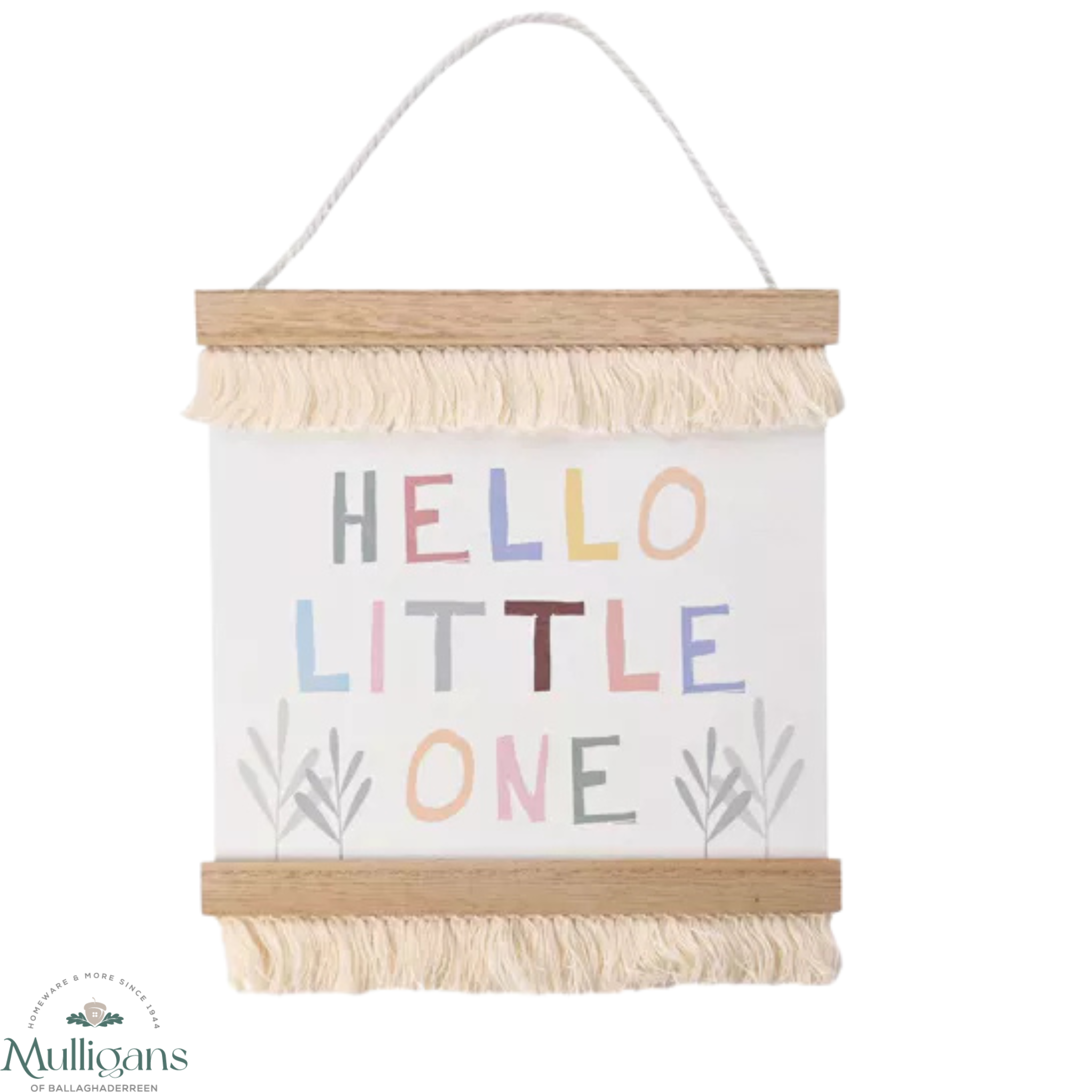 This charming hanging plaque would make a beautiful addition to a child's bedroom or nursery. The rustic tassle details complements the cute font and phrasing, whilst the pastel letters match the soft white background perfectly. Details: -Hanging Pendant with lovely "Hello Little One" phrase -Pastel lettering and rustic tassels