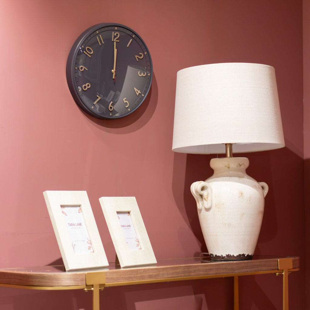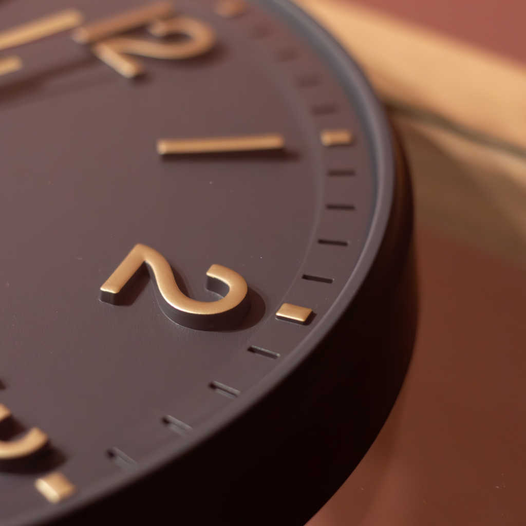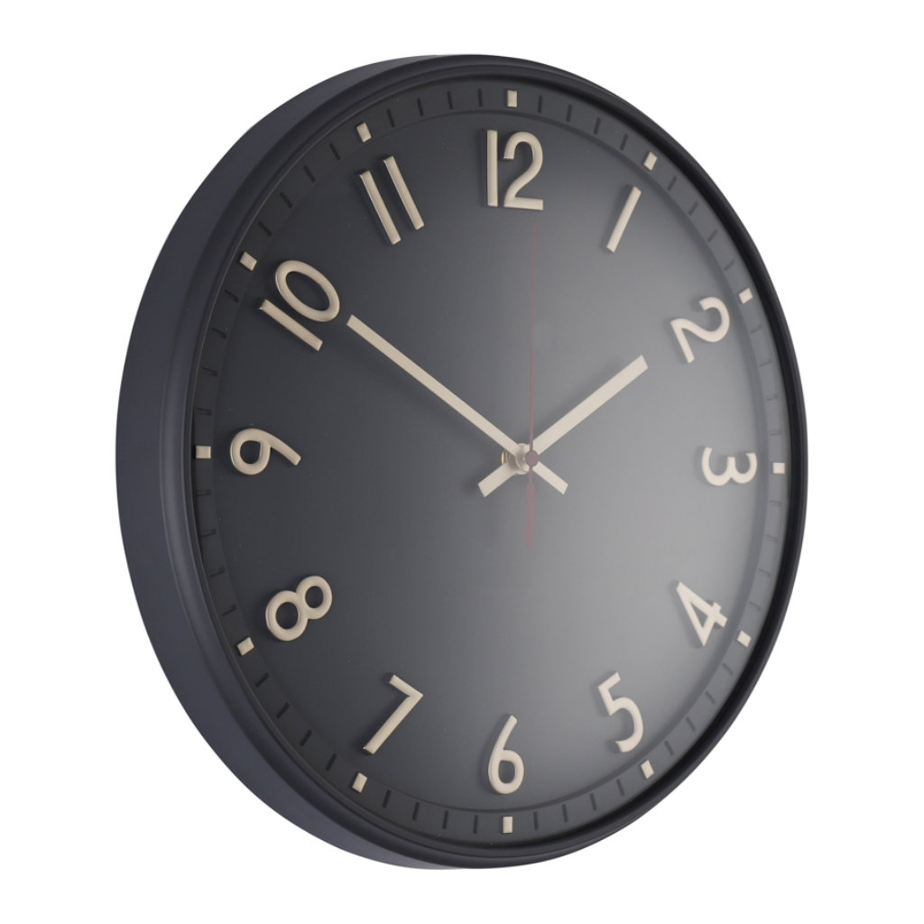 Ember Charcoal Wall Clock - 36cm This striking wall timepiece combines contemporary design with refined elegance. Measuring 36cm in diameter with a sophisticated charcoal finish, it commands attention in any room. Brass-coloured numerals and hands provide a warm contrast against the dark face, while the visible seconds hand adds functional detail. At just 4cm deep, it mounts seamlessly to your wall without protruding. Perfect for modern interiors seeking understated luxury and precision timekeeping.