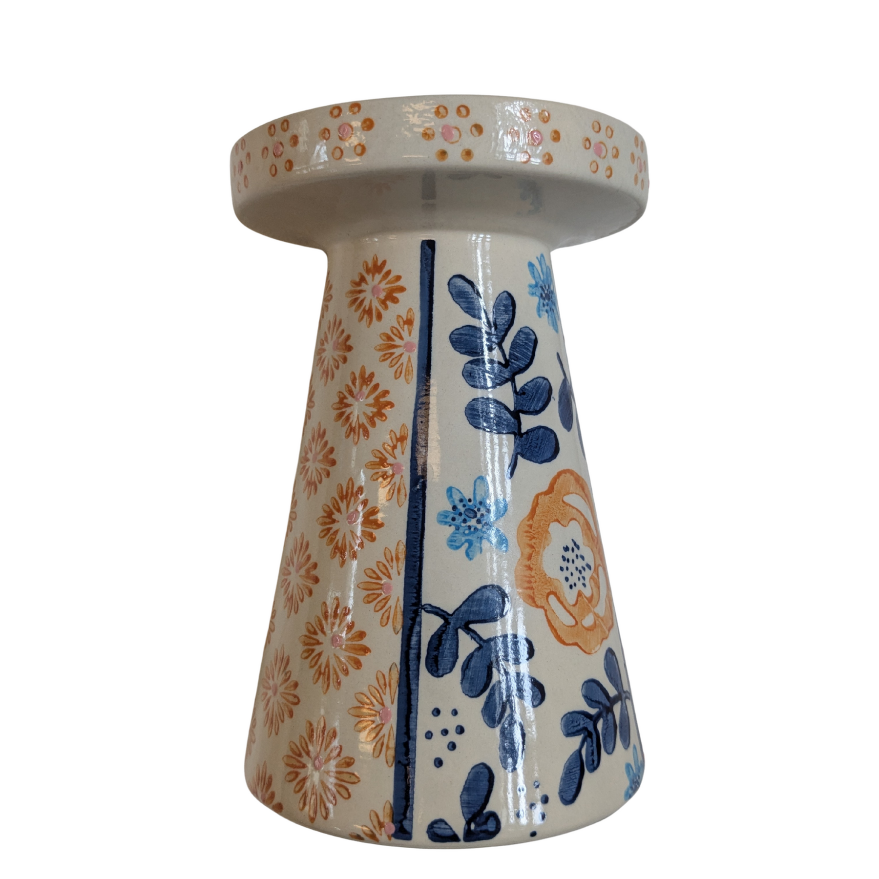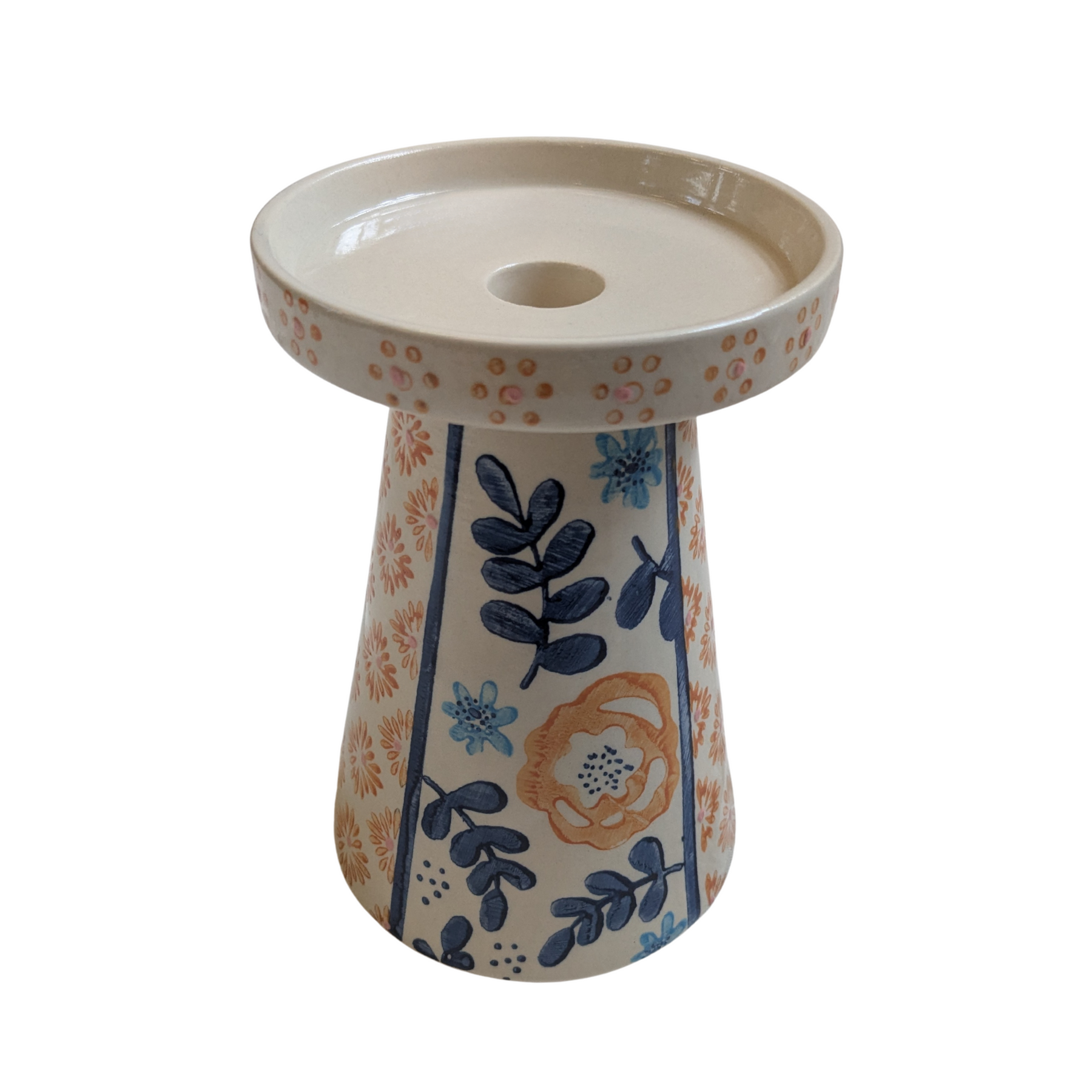 Elevate your space with this sophisticated ceramic candle holder, adorned with elegant orange and blue floral patterns. Standing 15cm tall with a 10cm diameter base and top, it perfectly accommodates candles up to 9cm in diameter or slender pillar candles of 2cm diameter. Its refined design adds a touch of artistry and warmth to any room.