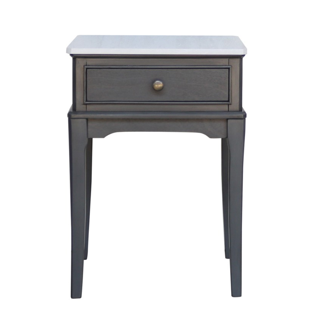 - The Monroe 1 Drawer Accent Table with Marble Top in Russell features a luxurious marble top that adds elegance to any room.