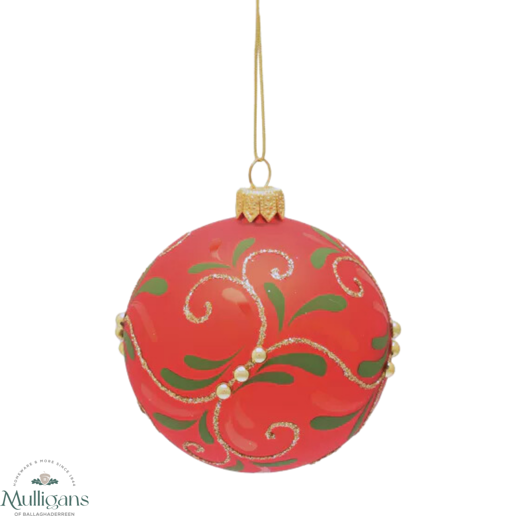 - A Mistletoe hand decorated red bauble. This ornate Christmas bauble exudes festive cheer and will stand out amongst the branches on the tree. The red glass bauble showcases a shiny finish, complete with a stunning design, gold glitter and colourful embellishments. It is displayed on the tree using its gold thread hanger.