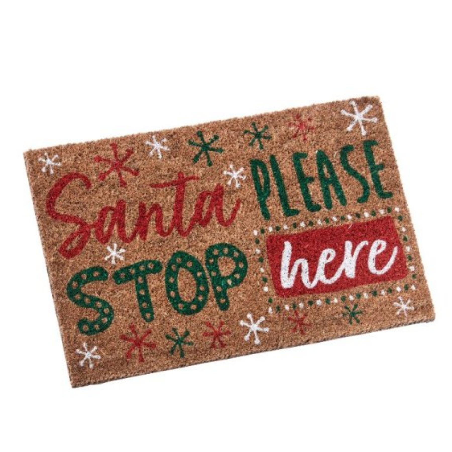 Welcome guests with a festive cheer using this playful "Santa Please Stop Here" doormat. Made from durable natural coir, it effectively removes mud and dirt from shoes and boots, keeping your home clean. The slip-resistant PVC backing ensures safety, while its easy-to-clean design means a quick brush is all it takes to refresh. Perfect for both indoor and outdoor use, this 40x60cm mat adds holiday spirit right at your doorstep.