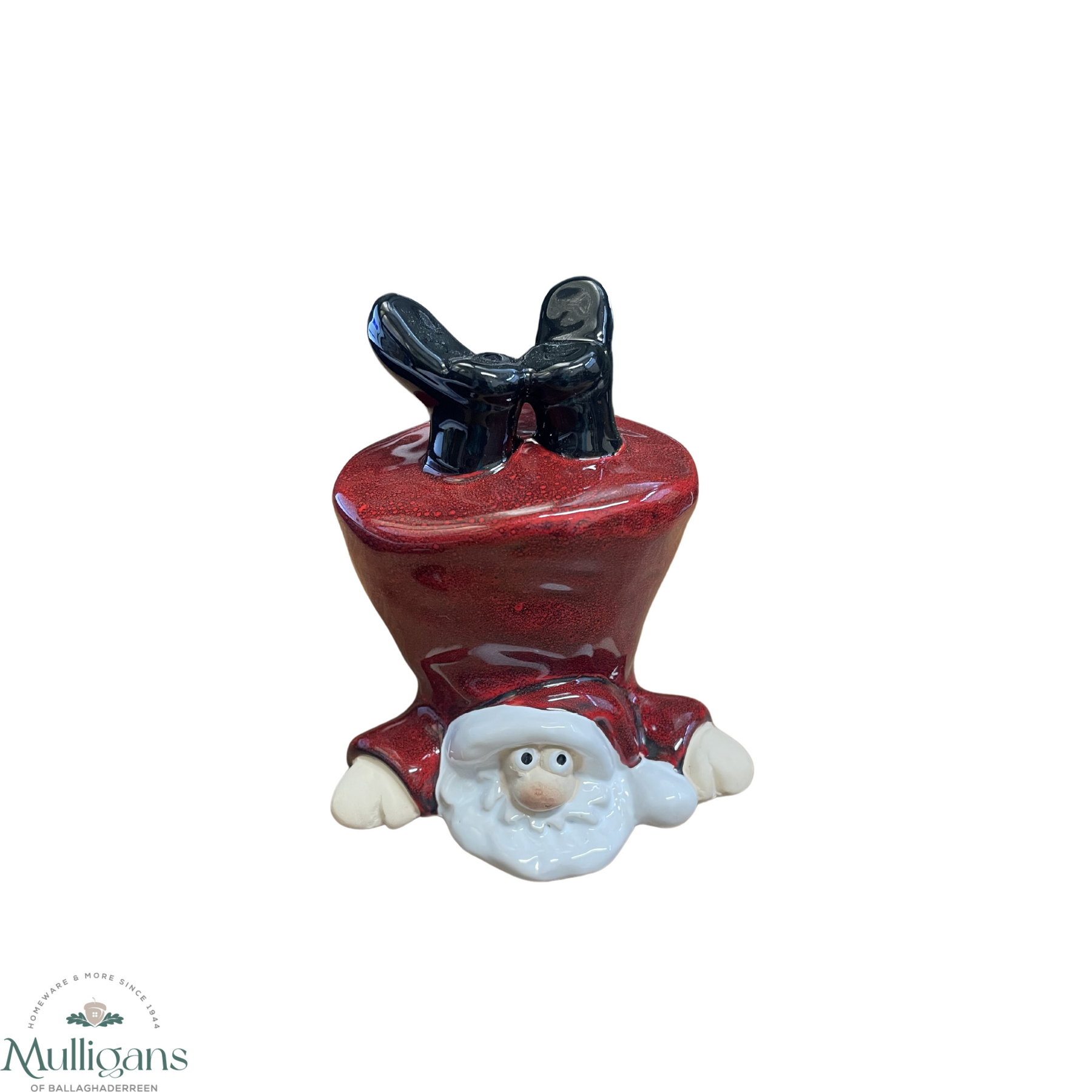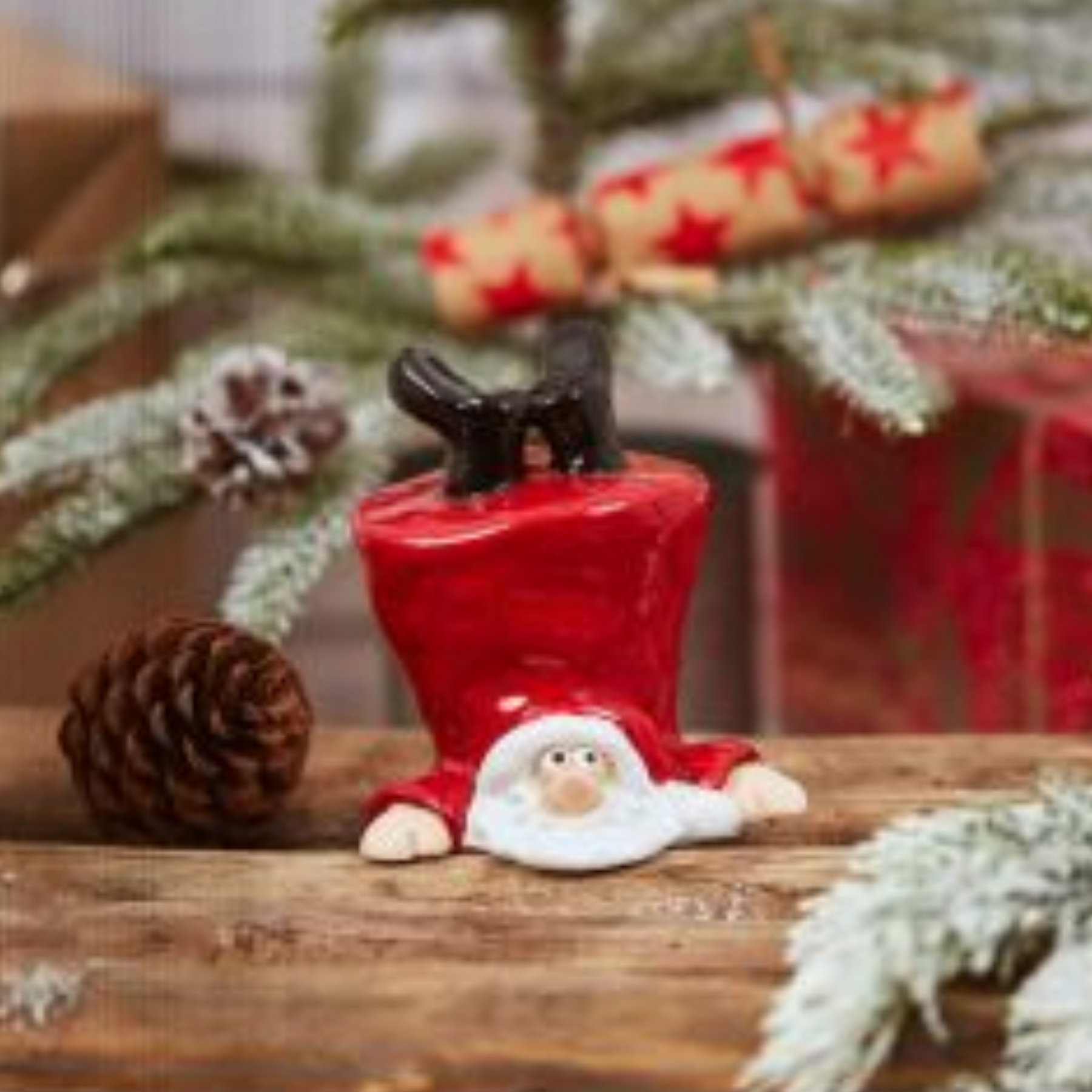 Add a humorous touch to your holiday decor with the Upside down Santa Ornament. This quirky ornament features Santa upside down on the ground, perfect for displaying on top of your mantle piece.