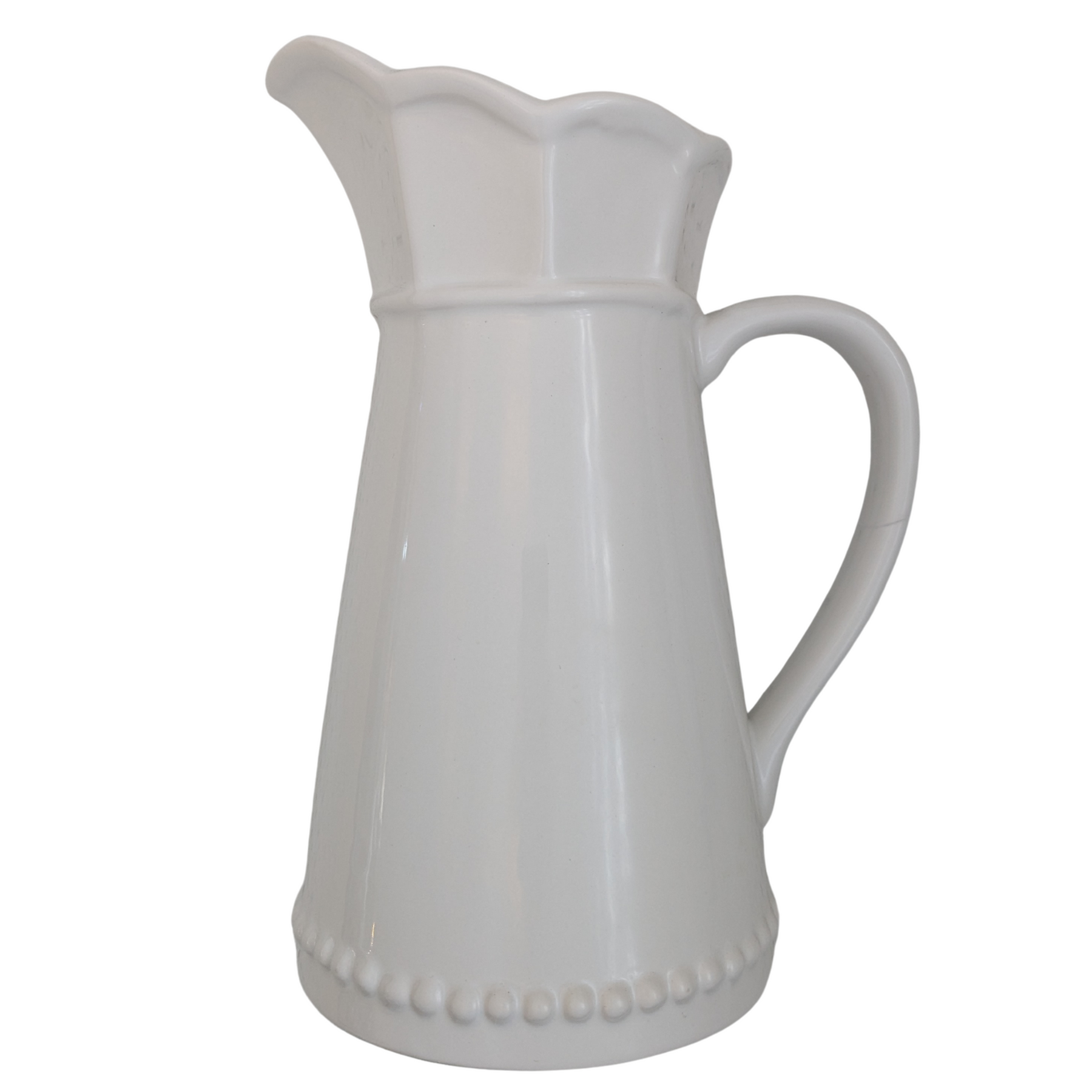 Elevate your table setting with this elegant white ceramic jug, featuring a delicately scalloped top and a generously sized handle for comfortable pouring. Measuring approximately 23x12x17 cm, its refined design blends classic charm with practical functionality, making it a sophisticated addition to any kitchen or dining room.